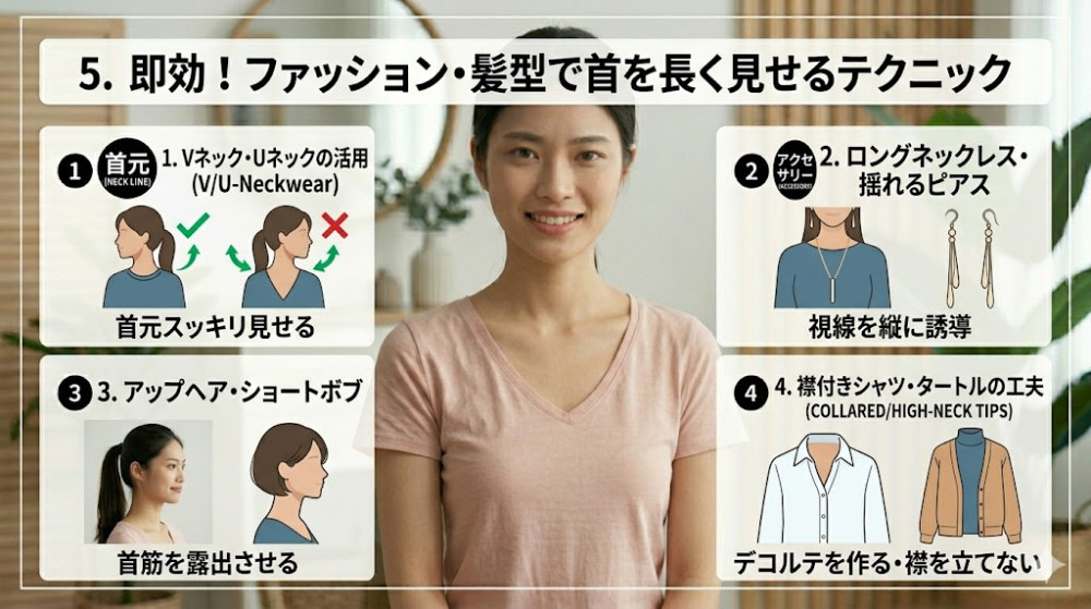 5. 即効!ファッション・髪型で首を長く見せるテクニック